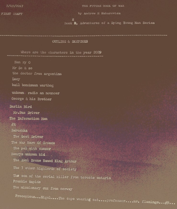 Going to start writing the last novel in my series. Doodle and outline sketches. Tip my toes in the cold water. Just, play around until I go on a southern residency in the fall. It’s called the future book of war. Told by two narrators. Hence, two different typewriters. Thought I’d share the process. The novel is going to be over a thousand pages long and take me two or three years to complete. So, here’s to…pseudo day one. Cheers.